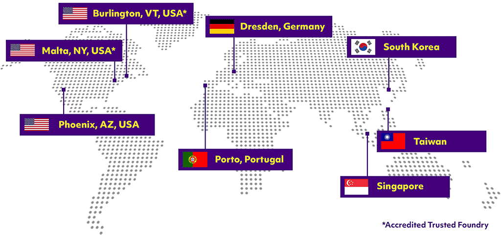 Leap from the starting line into a powerful finish when you partner with GF Every product starts from an idea, and you deserve a manufacturing partner that knows how to support you as you see it through. GF Manufacturing Services is a network designed to seamlessly get you from chip design to wafer fabrication to final assembly and test. With the advantages of a global footprint and a leading reputation in semiconductor manufacturing and testing, GF makes it easier for you to follow through on process so you can create the most effective product for your customers. Wherever your idea is headed, let GF help you get it to the finish line. 25+ years of experience RF testing leadership Global manufacturing footprint across the U.S., Europe & Asia Top partners all over the world Located worldwide, GF’s OSAT partners have been vetted and approved by GF so our customers can be confident in their products, from beginning to end. A world-class test solutions provider A leader in complex testing, GF has developed over 600 test solutions that provide customers with the reliability assurance they need at every stage of production. Extensive RF testing solutions High and low temperature test capabilities Analog and digital TxRx testing Memory testing including eNVM High speed interface test capabilities High voltage and high current testing ATE test programs Wafer services As a part of a full turnkey offering, GF offers Bump, Wafer Level Package and Probe capabilities, complemented by OSAT partnerships, to provide a one-stop-shop for customers’ wafer needs. Creating a reliable and high-quality path to production, GF streamlines manufacturing so customers can realize their designs quicker. Bump offerings for 200mm and 300mm, including SnAg bump, copper pillar and WLCSP Wafer sort with Known-Good-Die methodology Backside grind, wafer sort and bake, dicing, marking and binning services available Module services Comprehensive, reliable and supported by OSAT partners, GF’s Module services convert the manufactured wafer into a customized product with flexible packaging options. Industry standard packaging including scan bake tape Package and assembly capability complemented by GF trusted OSAT partners Test offerings: Complex RF tests, burn-in testing for early signs of failure and module final testing for pre-board certainty Engineering services From design to product packaging and testing needs, GF’s engineering services go beyond standard manufacturing practices to deliver the solutions that enable unique ideas to become reality. For questions of design feasibility, connectivity enablement and package resilience, GF has the experience and partnerships to address the specific questions customers need answered. Work with GF partners to perfect your design for manufacturing with GF’s design services Package engineering services, including electrical analysis, thermal analysis and mechanical analysis Wide range of reliability stress services to meet client qualification needs consistent with JEDEC, Mil-std and AEC specifications Engineering and debugging services available for all GF tests in production, including customer written test programs Test offerings: Choose from a range of test solutions including extensive state-of-the-art RF, analog and digital testing solutions backed by 22 years of high frequency mmWave test experience Contact Us